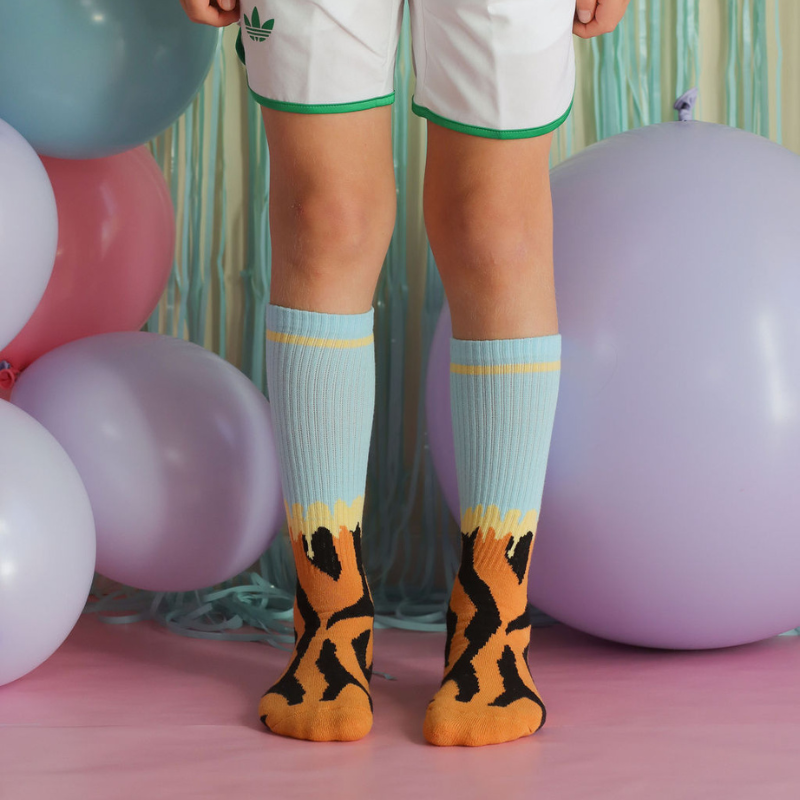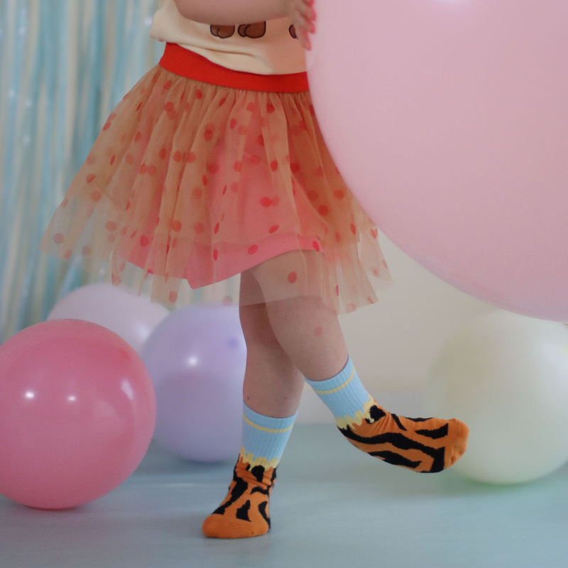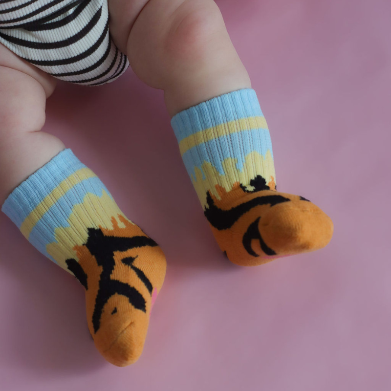 Våra strumpor är stickade i ett mjukt och skönt garn – just för att de ska kännas behagliga på små och stora fötter. Mjukare stickade material kan få lite ludd på utsidan, det är en naturlig del av garnets struktur och påverkar inte kvalitet, passform eller hållbarhet.